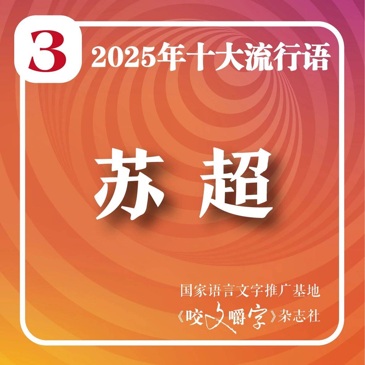 近日,《咬文嚼字》编辑部发布“2025年十大流行语”,苏超入选,并成为唯一入选的体育类词汇。其他入选的流行语还包括:韧性、具身智能、赛博对账、数字游民、谷子、预制XX、活人感、“XX基础,XX不基础”、“从从容容、游刃有余,匆匆忙忙、连滚带爬”。