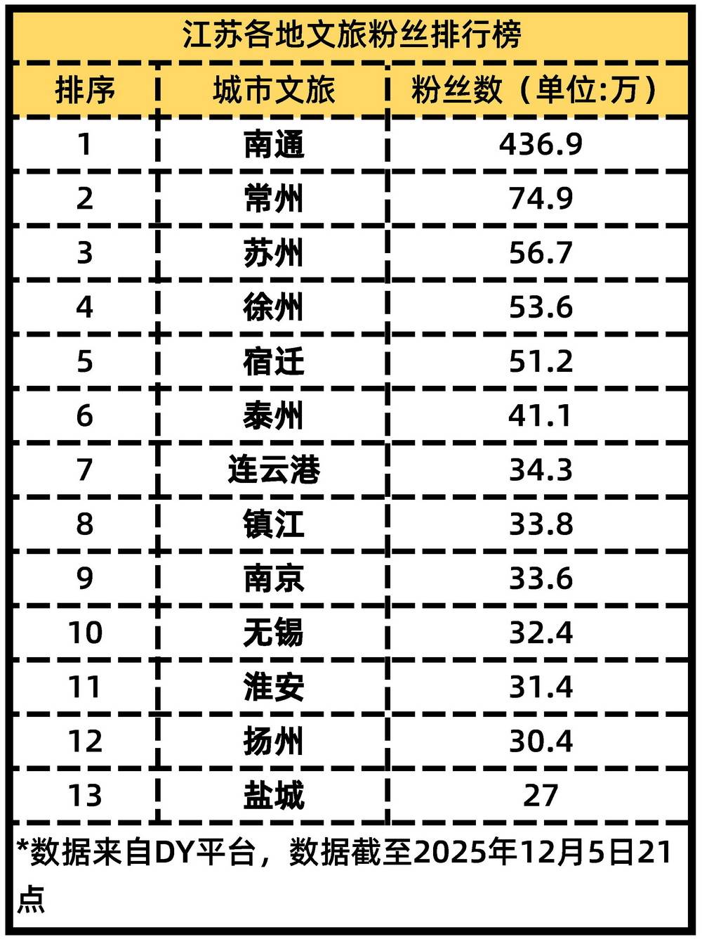 截至2025年12月5日21点,江苏13个城市文旅(DY)粉丝最新排行榜,苏超亚军南通第一,436万+,常宝常州第2,74.9万,苏州第3,56.7万,徐州第4,53.6万,宿迁第5,51.2万,苏超冠军泰州第6,41.1万,连云港第7,34.3万,镇江第8,33,8万,南京第9,33.6万,无锡第10,32.4万,淮安第11,31.4万,扬州第12,30.4万,盐城垫底,27万,也是唯一粉丝数在30万以下的文旅。盐城人口也不少,2025苏超盐城队常规赛第4,最终排第6,也涌现出庞智超、严子航等备受球迷喜爱的球星,为何文旅粉丝数垫底呢?