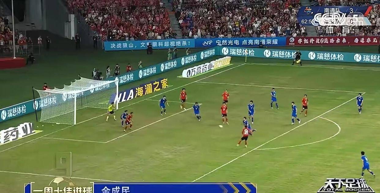 更精彩的一幕发生在第63分钟。金成民背对球门,突然跃起,身体在空中划出一道优美的弧线,一记技惊四座的侧身倒钩,将球狠狠地砸进网窝。他的动作舒展流畅,宛如C罗附体,引爆了全场。