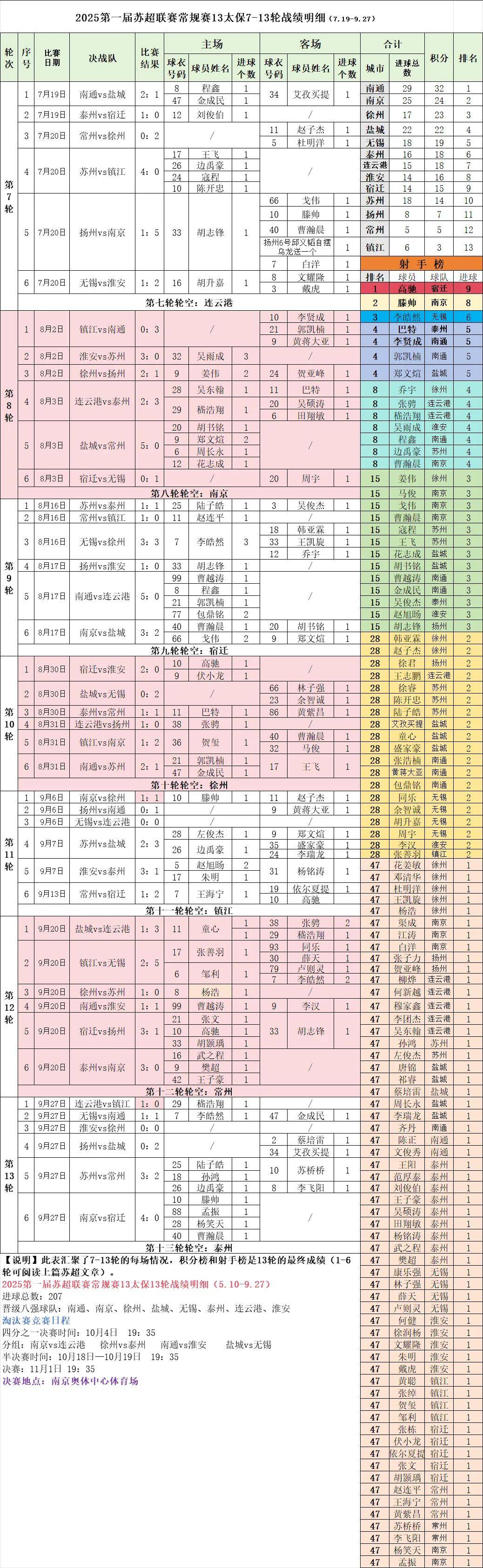 说明上篇苏超文章发布了常规赛1-6轮的战绩,有始有终,今天在上次的基础上汇总了13轮的战绩,做了个表,如下。