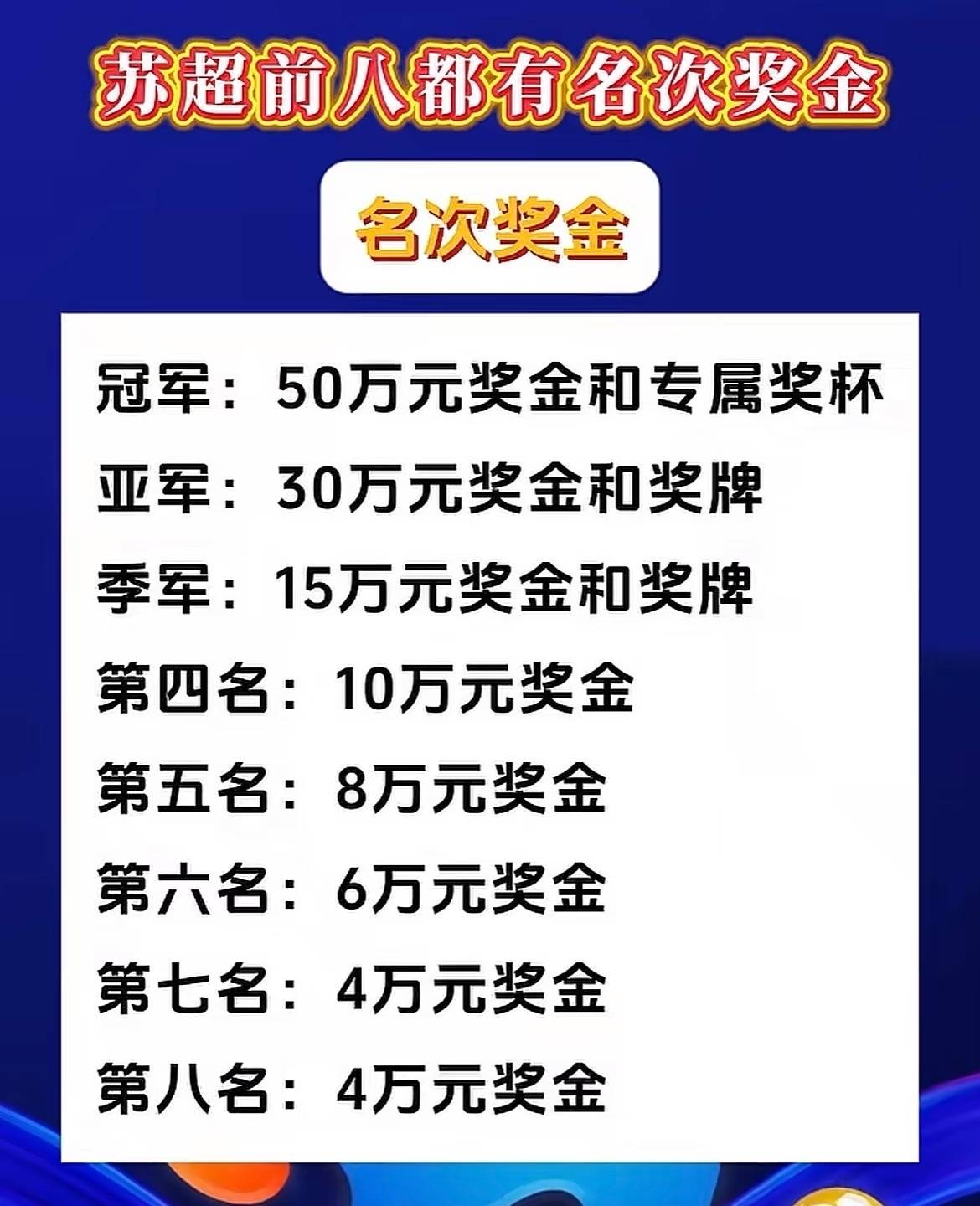 除去排名之外,江苏省体育局也早在上个月就公开了本届联赛的奖金分配情况。冠军将获得专属奖杯,并享有50万元奖金;亚军则获得30万元奖金,季军则有15万元;从第四名到第八名依次为10万元、8万元、6万元、4万元、4万元。虽然与中超联赛的奖金差距不小,但苏超联赛为队员们提供了一个更加轻松的竞技平台,尽管没有职业联赛的压力,但球员们依然能够全身心享受足球的乐趣。此外,还设有最佳球员和最佳教练等奖项,表彰在联赛中表现突出的个人。