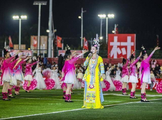 开幕式上的“村超村晚”,更像是一场民族文化的集中展演。以“感恩同行·团结奋进”为主题的晚会,将苗侗水瑶各族的文化特色融入其中,2300余名本土表演者都是普通村民、师生和志愿者,他们没有专业的舞台经验,却用最质朴的表演传递着最真挚的情感。侗族大歌的悠扬旋律回荡在球场,苗族蜡染服饰在灯光下熠熠生辉,舞蹈《龙马神韵》展现着乡村的蓬勃活力,诗朗诵《志愿者之光-致敬村超平凡英雄》讲述着赛事背后的坚守故事。当《想我就到贵州来》的旋律响起,全场观众齐声合唱,苗侗群众与游客手拉手跳起多耶舞,不分民族、不分地域的团结氛围,在这一刻达到顶峰。